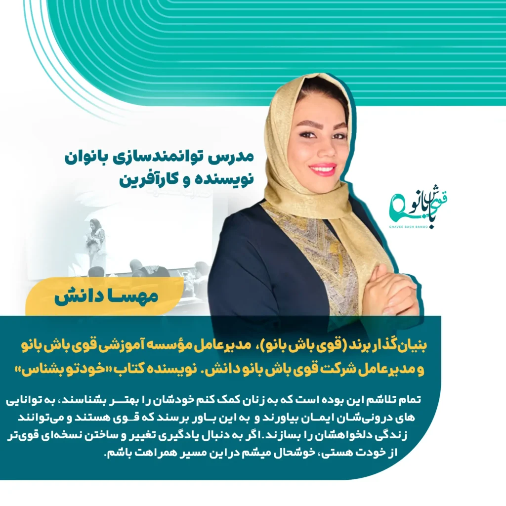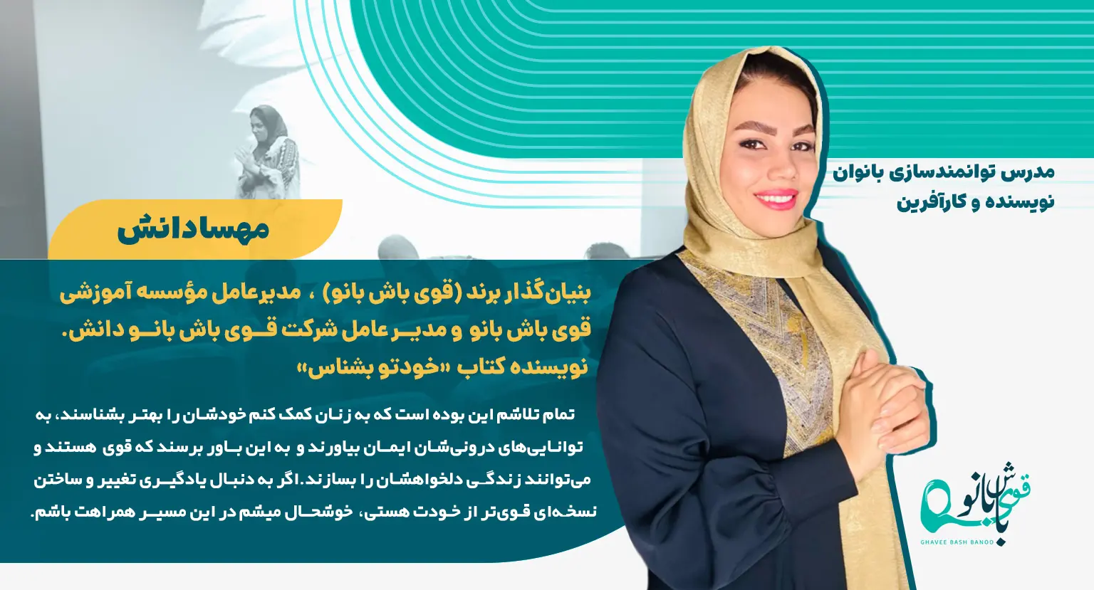 مدیرعامل مؤسسه آموزشی قوی باش بانو و مدیرعامل شرکت قوی باش بانو دانش.